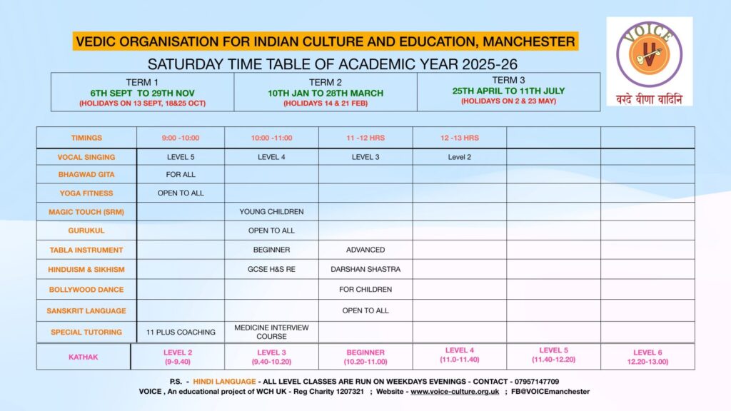At VOICE, our mission is to teach and share the richness of Indian heritage by offering 10+ diverse classes in languages, music, dance, drama, yoga, Vedic maths, and philosophy. We inspire students to grow academically and culturally by preparing them for recognized qualifications such as GCSE Religious Studies (Hinduism & Sikhism), Indian languages, music, tabla, Hindustani vocal, and classical dance (Kathak & Bharatanatyam).